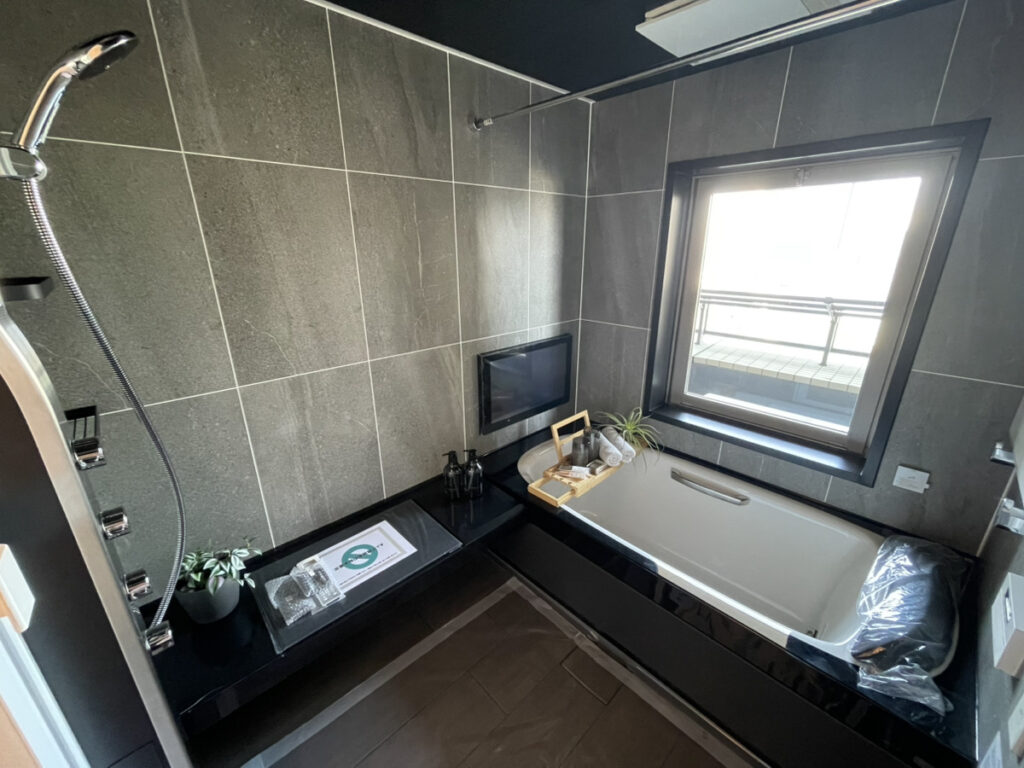 打たせ湯や浴室テレビも備えた、シックで上質なバス空間